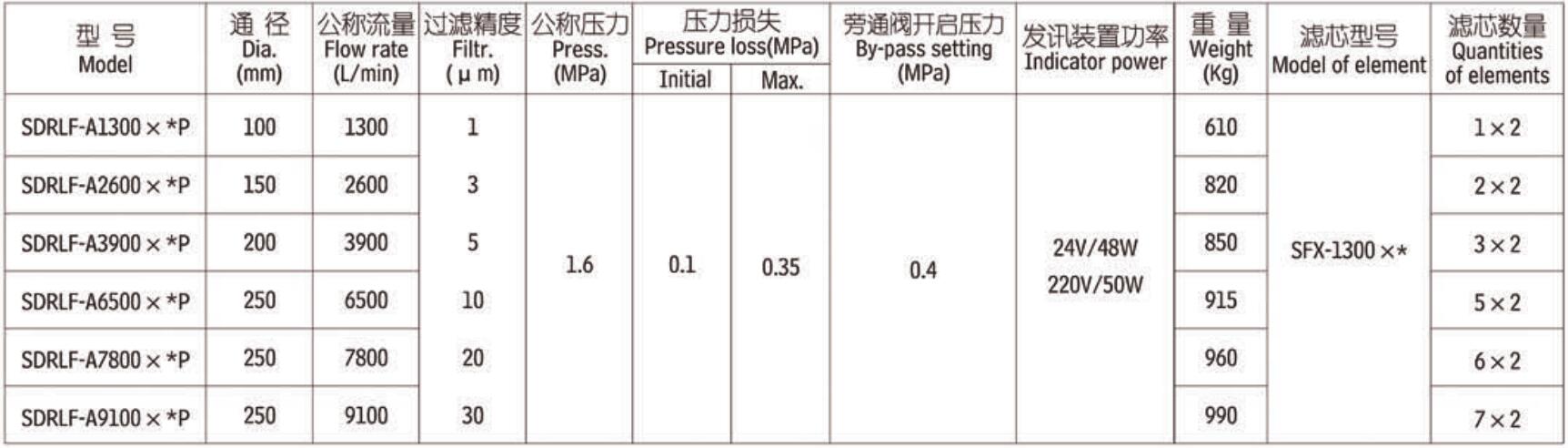 注:*為過濾精度 如過濾油液為一般液壓油,流量1300L/min、精度10微米,配置發(fā)訊器 型號為SDRLF-A1300*10P,濾芯型號為SFX-1300*10。